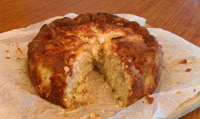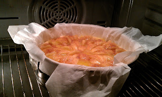 Æblerne skrælles og skæres i tynde både, så stikkes de ned i dejen, f.eks. i et flot mønster. Når æblerne er lagt på kagen drysses med sukker-kanel – jeg har ikke gået så højt op i præcis hvor meget der skulle bruges, jeg har bare brugt hvad jeg syntes der skulle til for at det dækkede. Til slut dryppes smeltet smør hen over kagen.