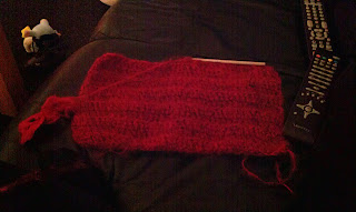 Jeg lave den af nogle garn-rester fra mit røde tæppe, har rigtig meget rødt garn til overs og kan jo lige så godt få det brugt inden jeg går ud og købe mere garn – så nu bliver mine næste projekter nok røde.