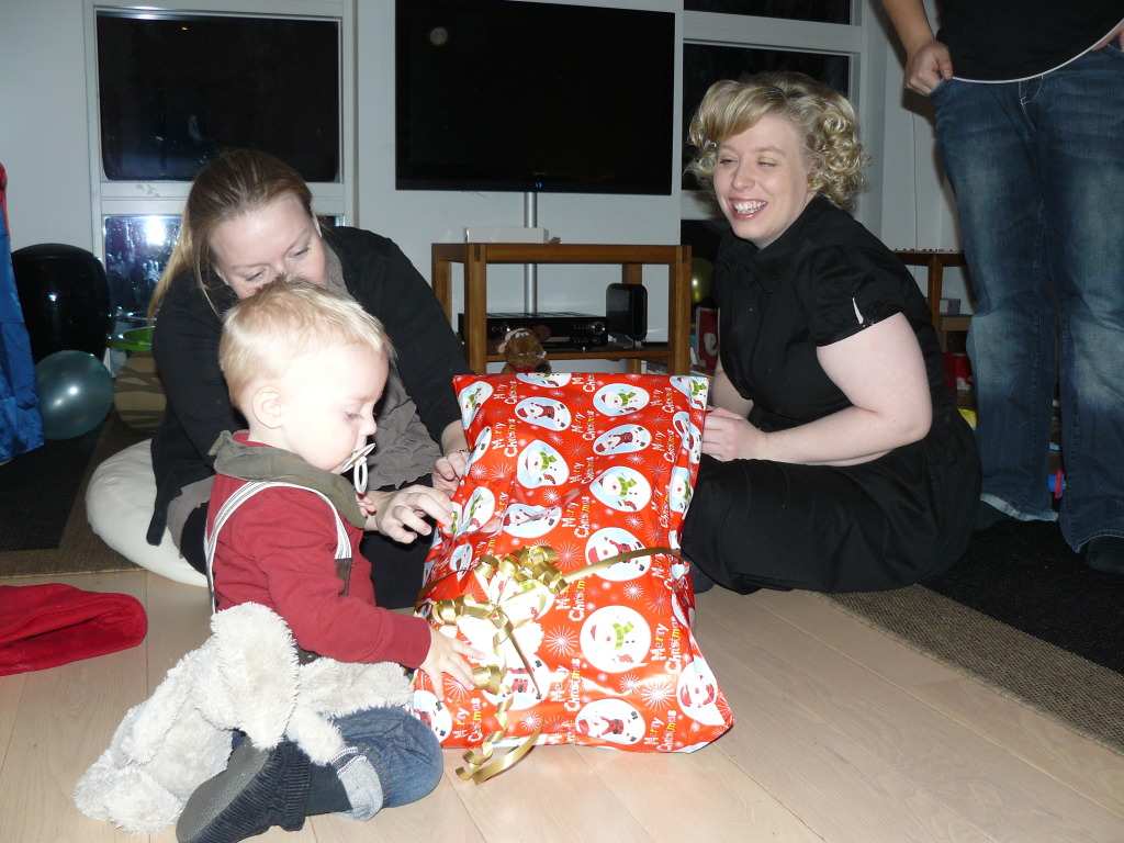 Casper sov en rigtig fin lur på et par timer – måske 3 timer. Man kunne godt mærke på ham at der skulle ske noget helt bestemt. Da kl. nærmede sig 16 kom Louise og Jeanette og sagde “God Jul” og vi åbnede gaverne fra Louise og hun åbnede sine fra os, for hun kunne ikke komme hjem til os 2. juledag og få gaver og julehygge.
