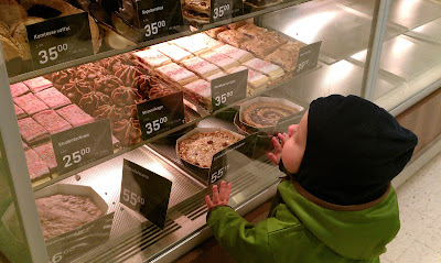 Da vi skulle hjem igen stoppede Casper lige op og kiggede på kagerne i bageren, han syntes sikkert at de så meget lækre ud.