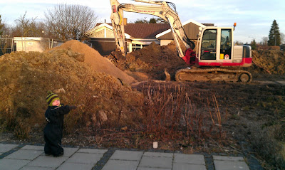 De er stadig igang med at grave inde hos naboen, Casper var helt vild da vi kom hjem fra vuggestuen og der holdt en stor gravemaskine lige inde ved siden af.