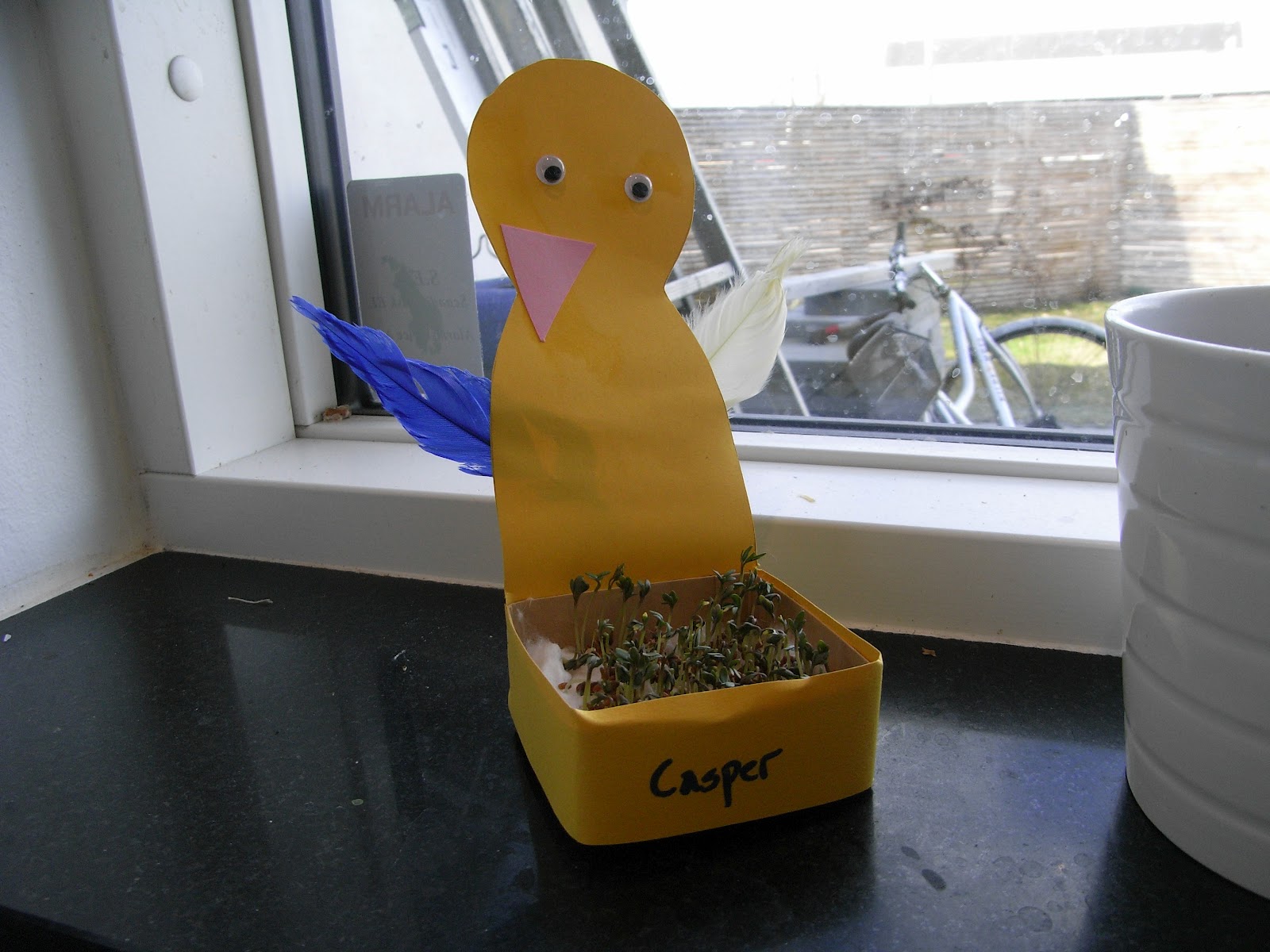 Da jeg hentede Casper ville han slet ikke med hjem, han hyggede sig så meget medat rutche og lege at han slet ikke havde tid. Til sidst fik jeg ham overtalt og da vi kom ind var der fine påske ting Casper havde lavet, en stor kylling med masser af fjer på og en karse kylling. Elsker at få ting med hjem som Casper har lavet.